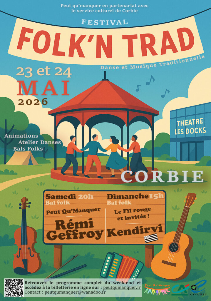 Chaque année à la pentecôte, notre gros événement à Corbie (80) et au Théâtre Les Docks c’est FOLK’N TRAD. Au programme des animations au camping, au kiosque, un atelier danse et des Bal Folk avec des groupes de renom !