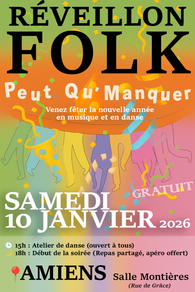 Comme chaque année, nous vous donnons rendez-vous pour fêter ensemble la nouvelle année et faire une rétrospective de l’année passée. Cette année, la soirée aura lieu Samedi 10 Janvier, Salle de Montières (rue de grâce) à AMIENS. Nous commencerons par un atelier de danse. C’est gratuit et ouvert à tous les musiciens, danseurs, connaissances et amis proches qui souhaitent participer ou découvrir le folk. Alors réservez la date. À bientôt et belles fêtes de fin d’année à toutes et tous !